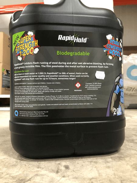 Flash rust is a general corrosion attack that presents a significant problem for abrasive blasters. Flash rust is problematic for dry blasting as well as wet blasting as blasting damages the passivating layer, which protects the metal from corrosion. In the case of vapour abrasive blasting, water is also present on the surface and in direct contact with the metal through the ruptured passivation layer. It is suitable for wet as well as dry abrasive blasting as well as acid bath rust removal. RapidHoldâ„¢ SuperStrength is extremely economical to use as it is double the concentrate and requires half the quantity.